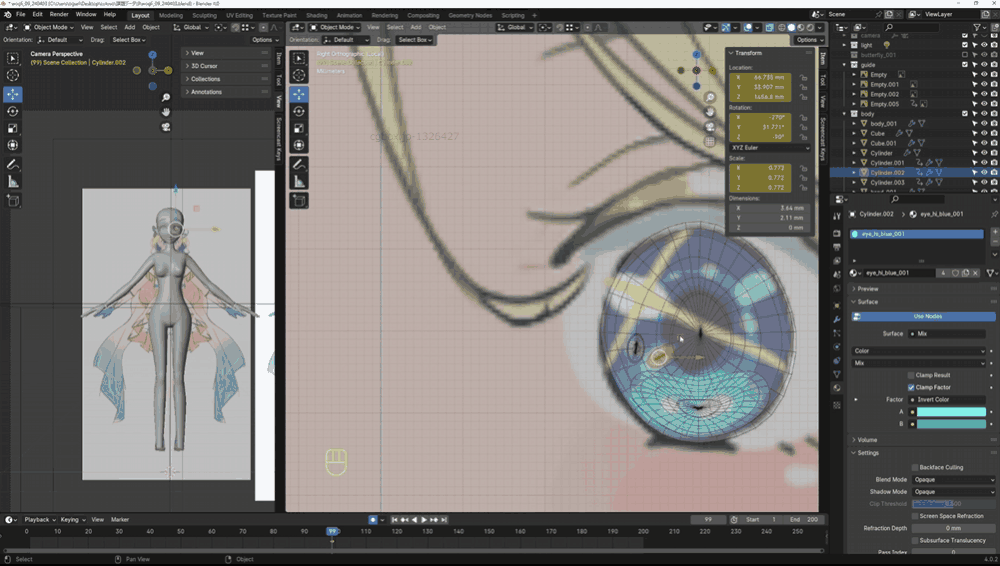 2Dイラストを元に、目のキラキラや髪のインナーカラーなどの情報を、テクスチャやUVを一切使わずにメッシュ割りを駆使して表現していきます。