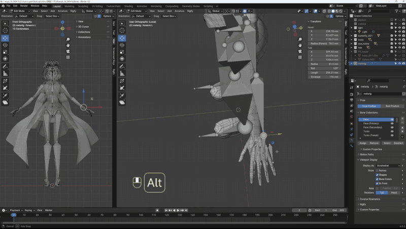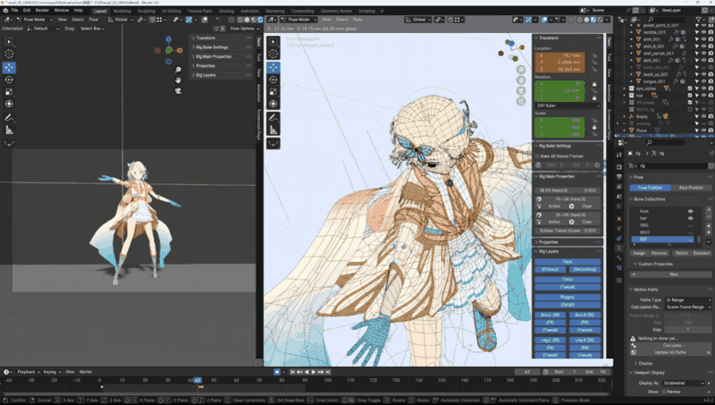 Blender標準搭載アドオン「Rigfy」を使って、キャラクターにポーズを付けるためのアーマチュア・リグを追加し、モデルの部位一つ一つをアーマチュアのボーンと関連付けるためのウェイトを付けていきます。