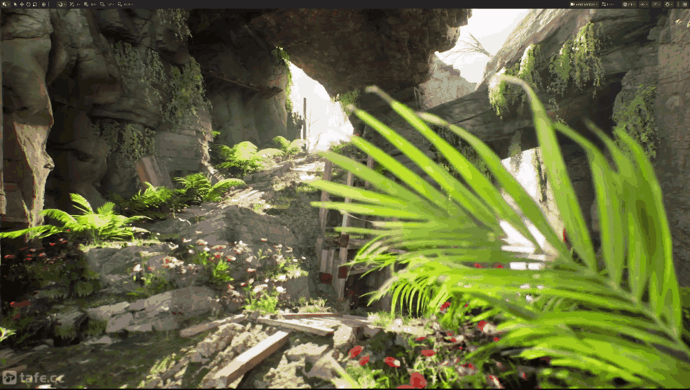 地面や壁面に苔やツタを生やすことで、シーンに色彩のバリエーションを追加していきます。