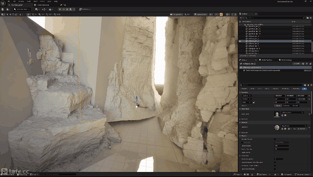 Unreal Engineのアセットマーケットプレイス「Fab」から、岩などのスタティックメッシュアセットをダウンロードして、ブロックアウトで作成した壁や地面に配置していきます。