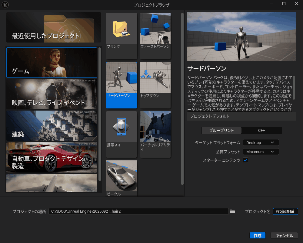 プリセットは「ゲーム」→「サードパーソン」を選択します。