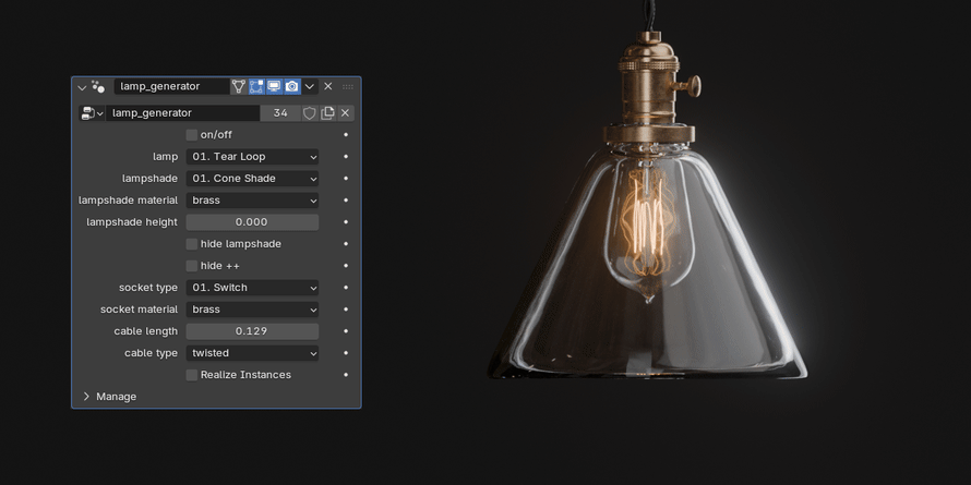 「Lamp Generator」は、電球・シェード・ソケットなどを自由に組み合わせて、ランプや照明器具を手軽に作成できるジオメトリノードアセットです。